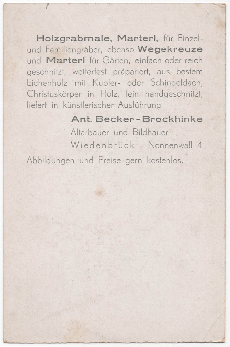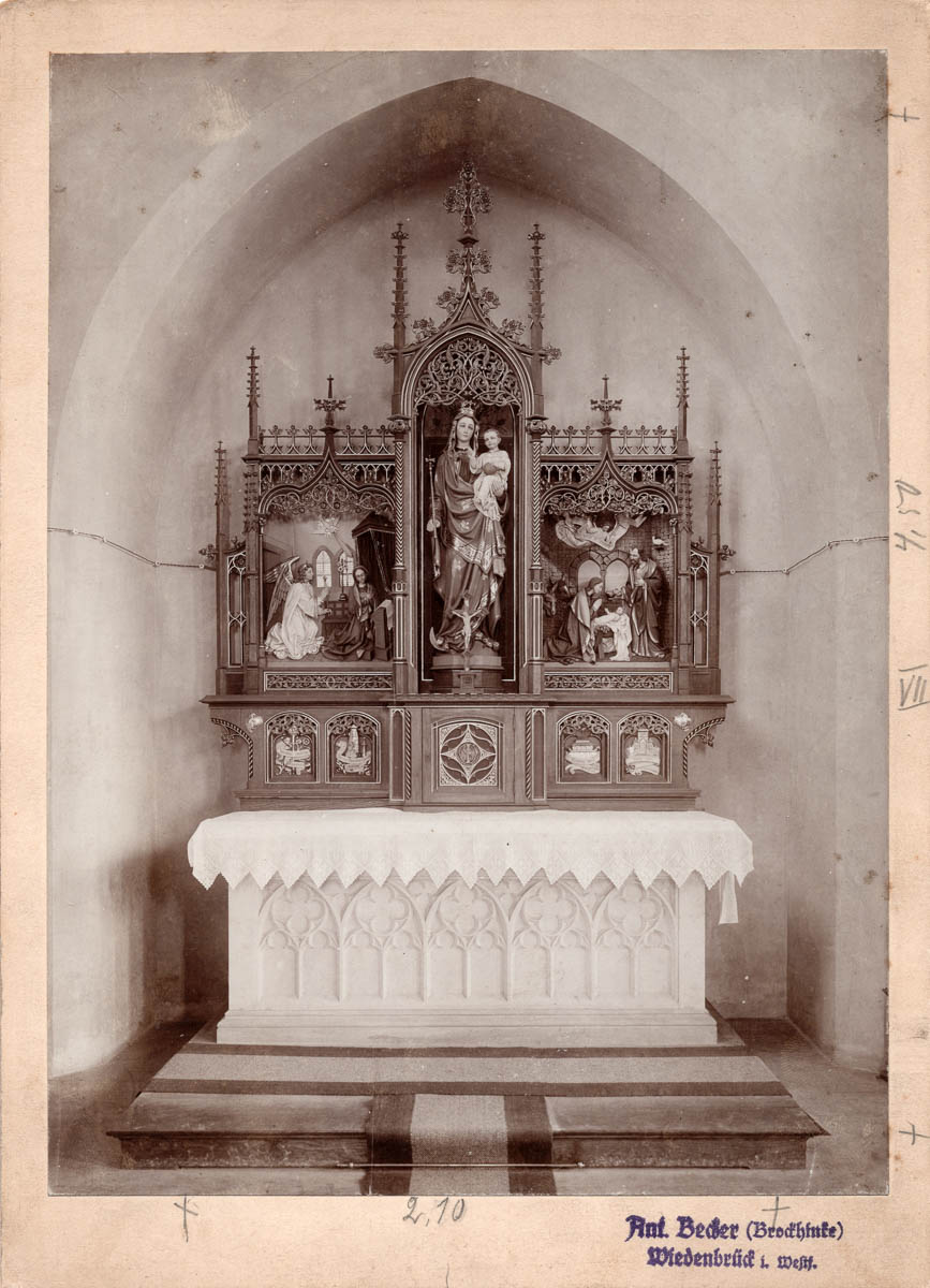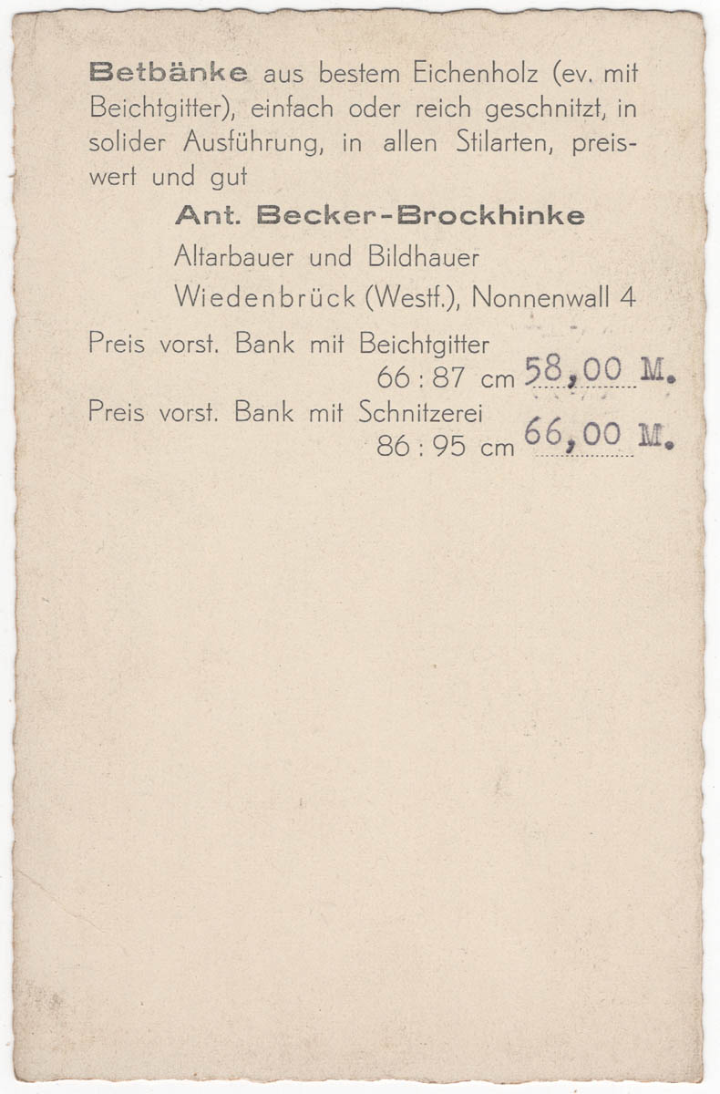 Das Wiedenbrücker Schule Museum besitzt aus dem Nachlass der heute nicht mehr vorhandenen Firma Altarbau-Firma Becker-Brockhinke einen Fotoarchiv. Die 277 historischen Fotos zeigen Produkte der Altarbaufirma. Die Abbildungen zeigen die erst von Theodor Brockhinke (1839 – 1890) und dann später von Anton Becker (1862 – 1945) gebauten Altäre, Kirchenbänke, Kanzeln und sakrale Einrichtungen. Interessant ist, dass Brockhinke tatsächlich ausgebildeter Tischler und Altarbildhauer war und die Firma aufbaute. Anton Becker, als sein Schwiegersohn, war aber Lehrer und führte die Firma seines Schwiegervaters, die er und seine Frau erbten, dann weiter. Wenn in den Quellen von Meister Becker die Rede ist, ist daher sicher, dass Anton Becker zwar „Chef“ der angesehenen Firma war, auch Verkauf, Marketing und kaufmännische Dinge beherrschte, aber selber kein Tischler oder Künstler war.